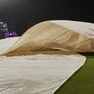 Ground staff pulls rain covers after rain interrupted the play during the Indian Premier League cricket match between Kolkata Knight Riders and Punjab Kings at Eden Gardens in Kolkata in…
