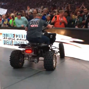 Stone Cold Steve Austin crashes his ATV at WrestleMania, knocks fan down