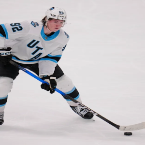 1 / 11 Utah Hockey Club center Logan Cooley skates with the puck against the Dallas Stars during the third period of an NHL hockey game Saturday, April 12, 2025,…