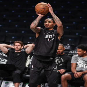 Apr 8, 2025; Brooklyn, New York, USA; Brooklyn Nets guard Keon Johnson (45) warms up prior to the game against the New Orleans Pelicans at Barclays Center. Mandatory Credit: Wendell…
