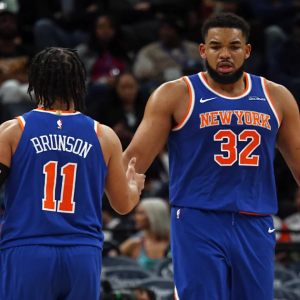 Feb 28, 2025; Memphis, Tennessee, USA; New York Knicks center Karl-Anthony Towns (32) reacts with guard Jalen Brunson (11) during the third quarter against the Memphis Grizzlies at FedExForum. Mandatory…