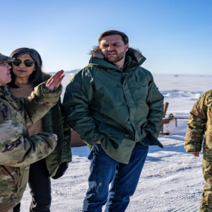 Vice President JD Vance (2R) and Second Lady Usha Vance (2L) listen to Col. Susannah Meyers (L), then-commander of the Pituffik Space Base, on a tour in Greenland on March…