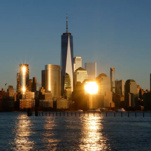 The sun sets on the skyline of lower Manhattan and One World Trade Center in New York City on April 8, as seen from Jersey City, New Jersey. Photo: Gary…