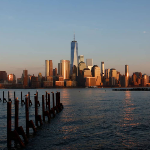 The sun on the skyline of lower Mahattan and One World Trade Center in New York City on March 5, 2025, as seen from Jersey City, New Jersey. A helicopter…