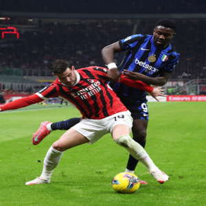 MILAN, ITALY – FEBRUARY 02: Theo Hernandez of AC Milan is put under pressure by Marcus Thuram of FC Internazionale during the Serie A match between AC Milan and FC…