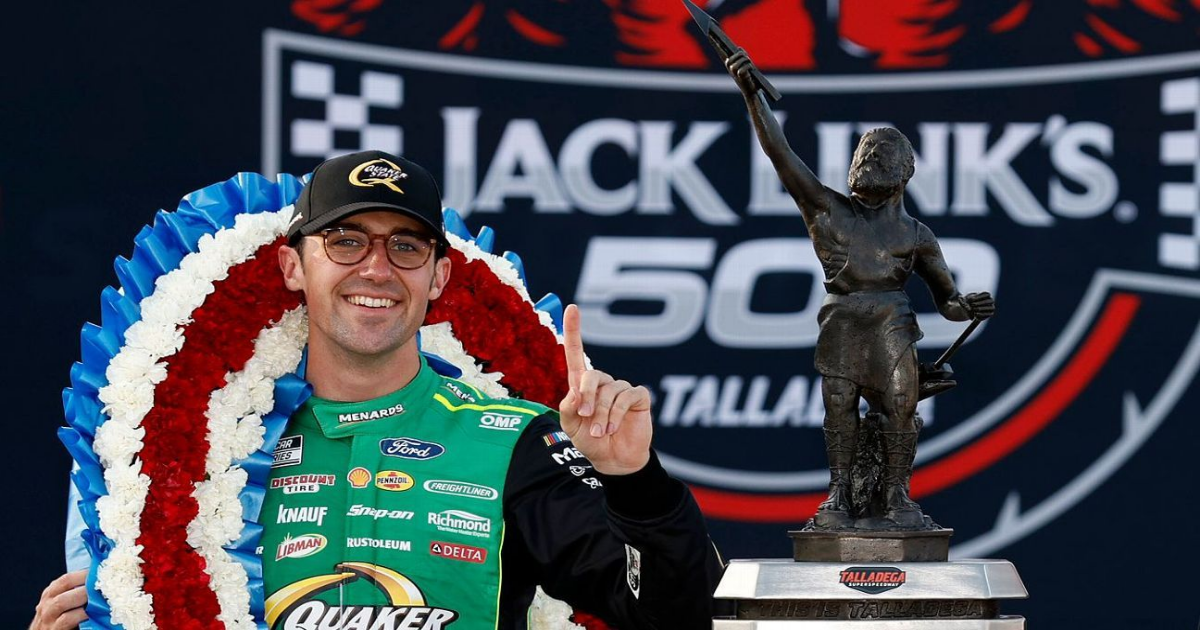 TALLADEGA, Ala. — Austin Cindric celebrated his first win of the season by wearing Talladega’s Superspeedway traditional victory wreath all around the track.