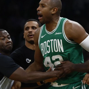 Apr 23, 2025; Boston, Massachusetts, USA; Boston Celtics center Al Horford (42) is held back by referee James Williams (60), head coach Joe Mazzulla and guard Jrue Holiday (4) after…