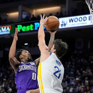 Thearon W. HendersonSACRAMENTO, CALIFORNIA – JANUARY 22: Malik Monk #0 of the Sacramento Kings shoots over Quinten Post #21 of the Golden State Warriors during the second half at Golden…
