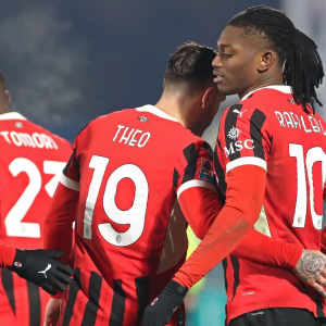 Rafael Leao of AC Milan celebrates with his team-mate Theo Hernandez after scoring their team’s second goal during the Serie A match between Como 1907 and AC Milan at Stadio…