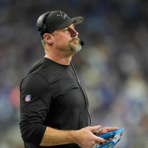 Detroit Lions head coach Dan Campbell watches a play against Washington Commanders during the first half of the NFC divisional round at Ford Field in Detroit on Saturday, Jan. 18,…