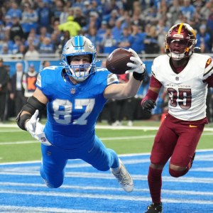 Sam LaPorta’s one-handed catch for a touchdown was a highlight of a high-scoring first half. (Photo by Nic Antaya/Getty Images) If you had the under for the Washington Commanders-Detroit Lions…