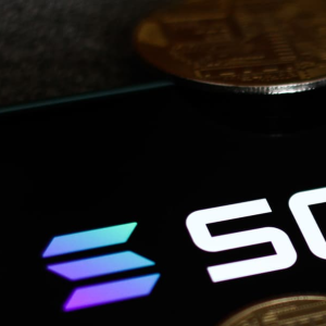 The Solana logo on a phone screen and representation of cryptocurrencies are seen in this photo taken in Krakow, Poland, Aug. 21, 2021. Solana’s SOL token rocketed after a memecoin…