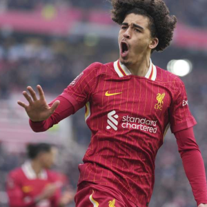Liverpool’s Jayden Danns celebrates after scoring his side’s third goal during the FA Cup soccer match between Liverpool and Accrington Stanley at the Anfield stadium in Liverpool, England, Saturday, Jan….