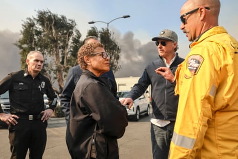 Karen Bass with Gavin Newsom, the governor, in Pacific Palisades on Wednesday. Photograph: Allison Dinner/EPA