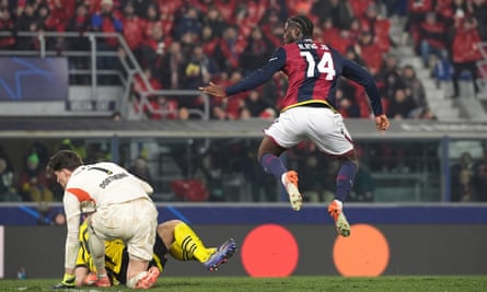 Samuel Iling-Junior scores for Bologna to earn a 2-1 home win over struggling Dortmund. Photograph: Massimo Paolone/AP