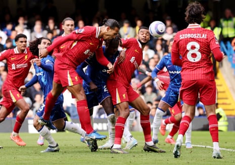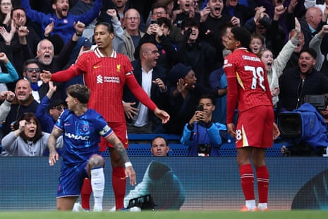 50 min: Van Dijk is given a yellow card for a late tackle on Lavia, with the Chelsea player receiving some stud marks on his white boots. VAR did double check to see if the booking should be upgraded to a red, but Van Dijk’s foot was deemed to be sufficiently low. Yellow is correct, in my book.