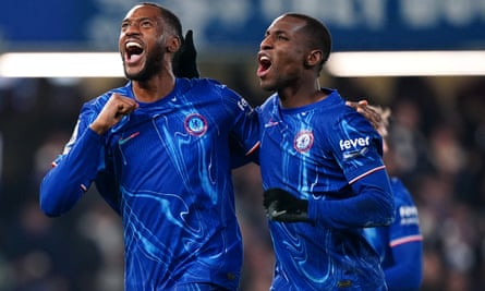 Tosin Adarabioyo (left) celebrates scoring Chelsea’s opener with Nicolas Jackson. Photograph: Zac Goodwin/PA