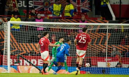 In a first start in Europe for United (and only a third for the club) Toby Collyer flapped in midfield, lost possession, Hamza Igamane ran forward, and Altay Bayindir’s goal was threatened by Ridvan Yilmaz. Other losses of cool had Matthijs de Ligt booting the ball straight out and plumb to a blue shirt, and, when Yilmaz volleyed James Tavernier’s cross, Bayindir’s save was sharp.