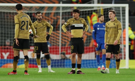 Real Sociedad’s Jon Aramburu (no 19) and his teammates are left dumbfounded after his red card. Photograph: Phil Noble/Reuters