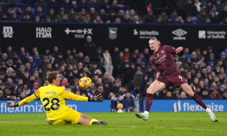 Erling Haaland scores Manchester City’s fifth goal as the champions moved back into the top four for 24 hours at least. Photograph: Bradley Collyer/PA