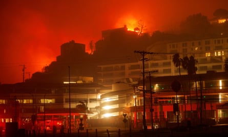 A building burns during the Palisades Fire in the Pacific Palisades neighborhood of west Los Angeles, California, 7 January, 2025. Photograph: Mike Blake/Reuters