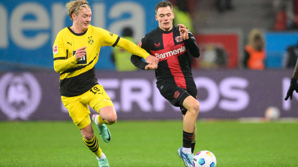 Stehen sich am Freitagabend gegenüber: Dortmunds Julian Brandt (li.) und Leverkusens Florian Wirtz. IMAGO/Sven Simon