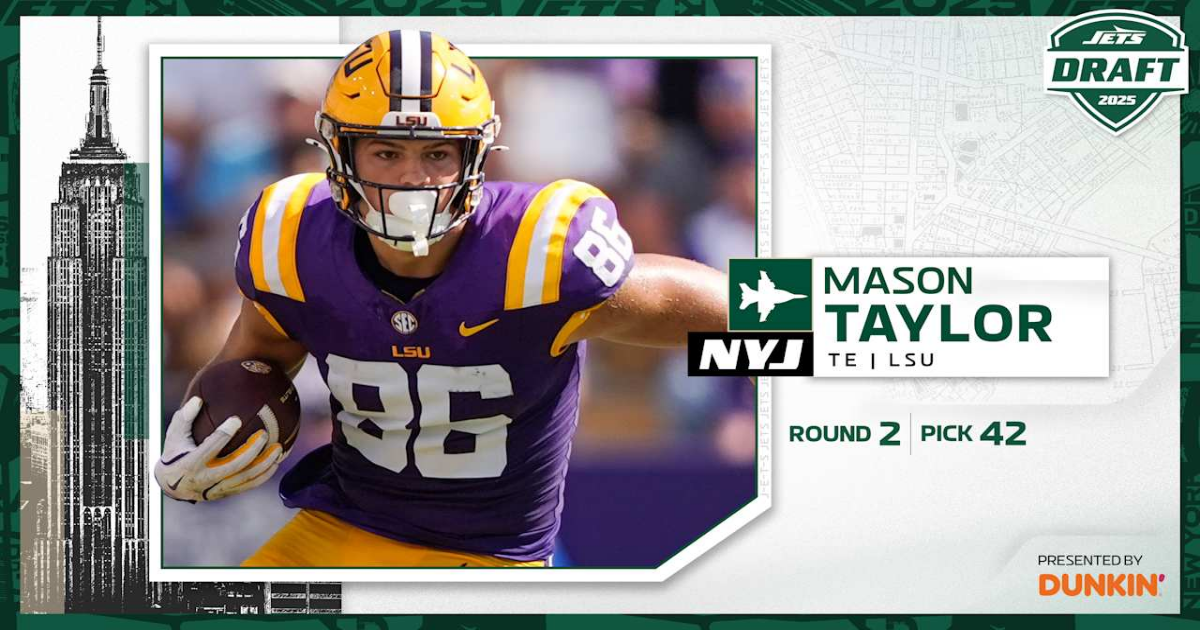 The Jets, making their second choice of the 2025 NFL Draft, their first of draft night No. 2, and the draft’s 42nd selection, overall, made another pick for their offense with tight end Mason Taylor of LSU.