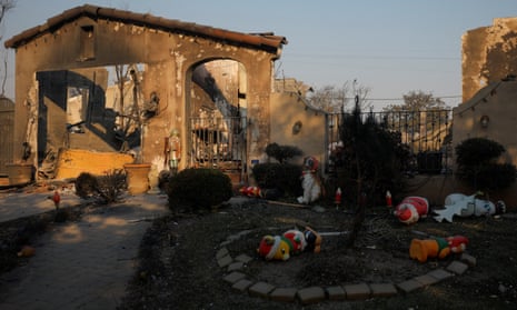 Christmas decoration lie in the front yard of a house burned down by the Palisades Fire in the Pacific Palisades neighborhood, in Los Angeles, California, US, 9 January, 2025. Photograph: Mike Blake/Reuters