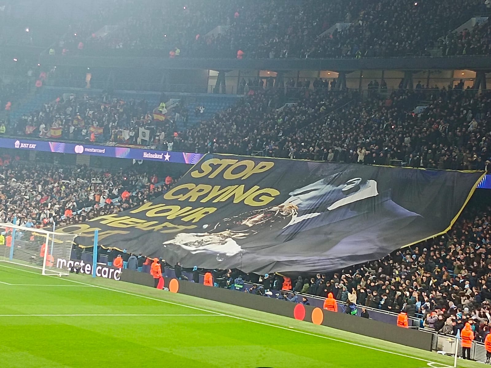 Tifo del City antes del partido: “Deja de llorar”, con foto de Rodri tras ganar el Balón de Oro