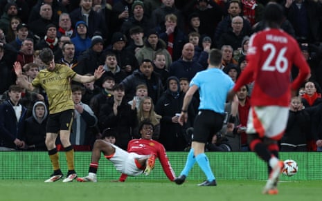 42 min A little earlier we discussed Amorim’s coaching chops; well, the performances we’re seeing tonight from Zirkzee and Hojlund, though not world-beating, show they’ve listened and learnt. Meantime, United win a free-kick that Fernandes will swerve in … or paste over the bar for no apparent reason/