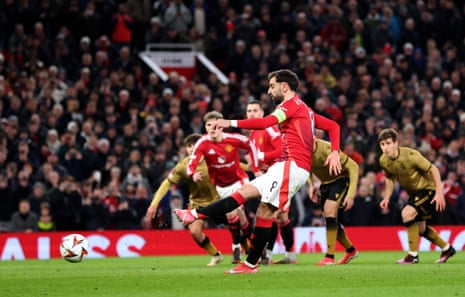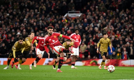 Bruno Fernandes is the man on the spot and United lead. Photograph: Gareth Copley/Getty Images