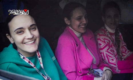 This image grab from a handout video released by the Hamas Media Office shows Israeli hostages (L to R) Emily Damari, Romi Gonen, and Doron Steinbracher, who were abducted by Palestinian militants during the 7 October, 2023 attacks, sitting in a Hamas vehicle before being handed over to the International Committee of the Red Cross (ICRC) in the Gaza Strip on 19 January, 2025 after a ceasefire and hostage-prisoner exchange deal in the war between Israel and Hamas was implemented. Photograph: AFP/Getty Images