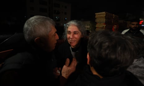 Palestinian leader of the Popular Front for the Liberation of Palestine (PFLP), Khalida Jarrar (C) greeted by relatives as she arrives in Ramallah, early 20 January 2025, from the Israeli military prison of Ofer, in the West Bank city of Ramallah, ahead of the release of Palestinian prisoners in the Israel-Hamas release deal, amid a ceasefire between Israel and Hamas. Photograph: Alaa Badarneh/EPA