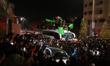 People react as a bus carrying released Palestinian prisoners from the Ofer Israeli military prison arrives in Ramallah, early 20 January 2025, amid a ceasefire and hostage release deal between Israel and Hamas. Israel and Hamas agreed on a hostage release deal and a Gaza ceasefire to be implemented on 19 January 2025. Photograph: Alaa Badarneh/EPA