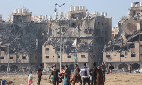 Building lie in ruin as Palestinians carry their belongings following Israeli strikes on residential buildings at the Qatari-funded Hamad City, amid the ongoing conflict between Israel and the Palestinian Islamist group Hamas, in Khan Younis in the southern Gaza Strip 2 December, 2023. Photograph: Ahmed Zakot/Reuters
