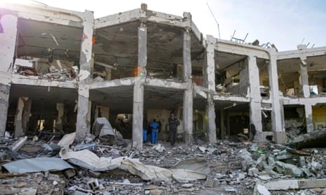 Palestinian medics inspect the damage of Al Najjar hospital that was destroyed by Israeli airstrikes on Rafah, as a ceasefire deal between Israel and Hamas went into effect, Gaza Strip, Sunday, 19 January, 2025. Photograph: Jehad Alshrafi/AP