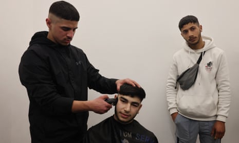 Seventeen-year-old Palestinian prisoner Qassem Jaafra (C) gets a haircut upon his arrival home in the Silwan neighbourhood in east Jerusalem, following his release in the early hours of 20 January, 2025 along with 90 other Palestinian prisoners from an Israeli jail. The Israel Prison Service said it had completed the release of 90 Palestinian prisoners early on January 20, as part of a Gaza ceasefire deal that took effect a day earlier and saw the released of three Israeli female hostages who were held by Hamas in the Gaza Strip. Photograph: Ahmad Gharabli/AFP/Getty Images