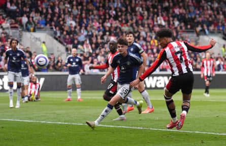 Kevin Schade scores his second goal of the match for Brentford. Photograph: John Walton/PA