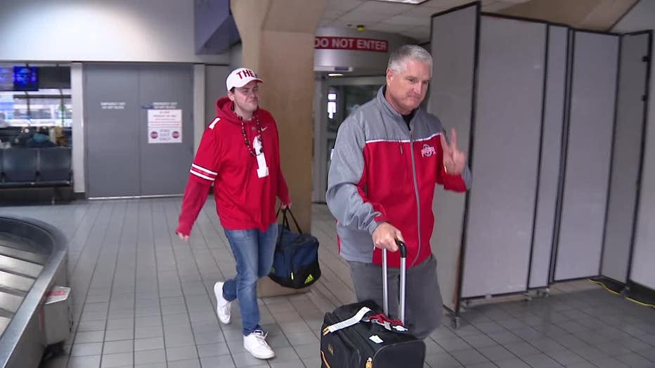Ohio State fans Mark Lowary and his son Braidan managed to make it to North Texas Friday morning after their plane was de-iced in El Paso and cleared for takeoff.