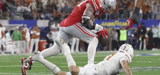 Ohio State defensive end Jack Sawyer, top, runs for a touchdown after recovering a fumble by Texas quarterback Quinn Ewers, bottom, during the second half of the Cotton Bowl College Football Playoff semifinal game, Friday, Jan. 10, 2025, in Arlington, Texas. (AP Photo/Gareth Patterson)