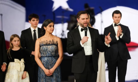 US Vice-President JD Vance (Center R) speaks to supporters with Second Lady Usha Vance (Center L) by his side at the Liberty Ball, one of the events being held following US President Donald Trump’s inauguration in Washington, DC, USA, 20 January 2025. Photograph: Maasni Srivastava/EPA