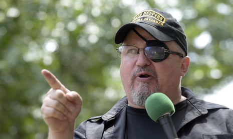 FILE – Stewart Rhodes, founder of the citizen militia group known as the Oath Keepers speaks during a rally outside the White House in Washington, on June 25, 2017. Photograph: Susan Walsh/AP