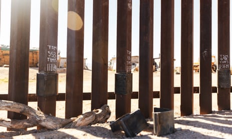 Repairs to the border wall are marked in white paint, with leftover materials scattered nearby, just a few miles west of the Lukeville, Arizona, to Sonoyta, Mexico, port of entry on the US-Mexico border, on January 9, 2025. Photograph: Thalia Juarez/The Guardian