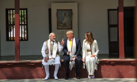 A handout photo made available by the Ministry of External Affairs, Government of India shows US President Donald J. Trump (C) and US First Lady Melania Trump (R) speaking to India’s Prime Minister Narendra Modi (L) during their visit at Gandhi Ashram in Ahmedabad, India, 24 February 2020. Photograph: Ministry Of External Affairs/EPA