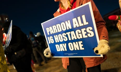 A person holds a placard as people gather outside the DC Central Detention Facility, commonly known as the DC Jail, in anticipation of a potential pardon by U.S. President Donald Trump for individuals convicted in connection with the January 6, 2021 attack on the United States Capitol, in Washington, DC, USA, 20 January 2025. Trump, on 20 January, issued pardons for more than 1,000 people convicted for their roles in the January 6 Capitol riot. Photograph: Will Oliver/EPA