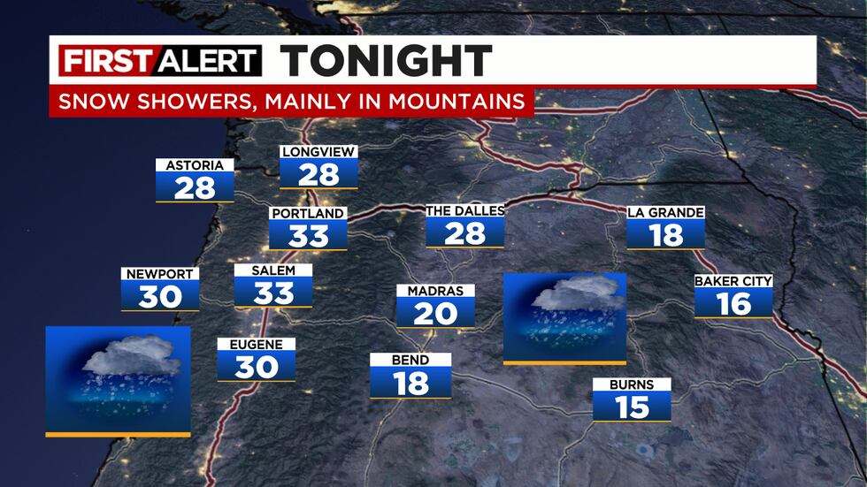 Scattered showers continue through this evening with sticking snow remaining above 1,000′. After midnight, those showers should end, and a few areas of clearing may lead to fog. Expect a few spots of fog, frost, and even an icy road is possible for the morning commute (similar to Tuesday).