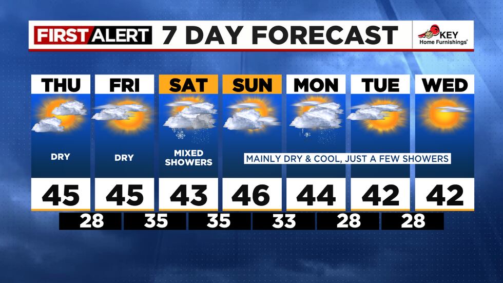 We aren’t expecting any significant weather this weekend. A few scattered showers are possible Saturday, which may fall as a rain/snow mix at times. A bulk of the weekend will be dry with highs in the mid 40s and lows in the 30s. Watch for patchy ice from overnight refreezing in the mornings.