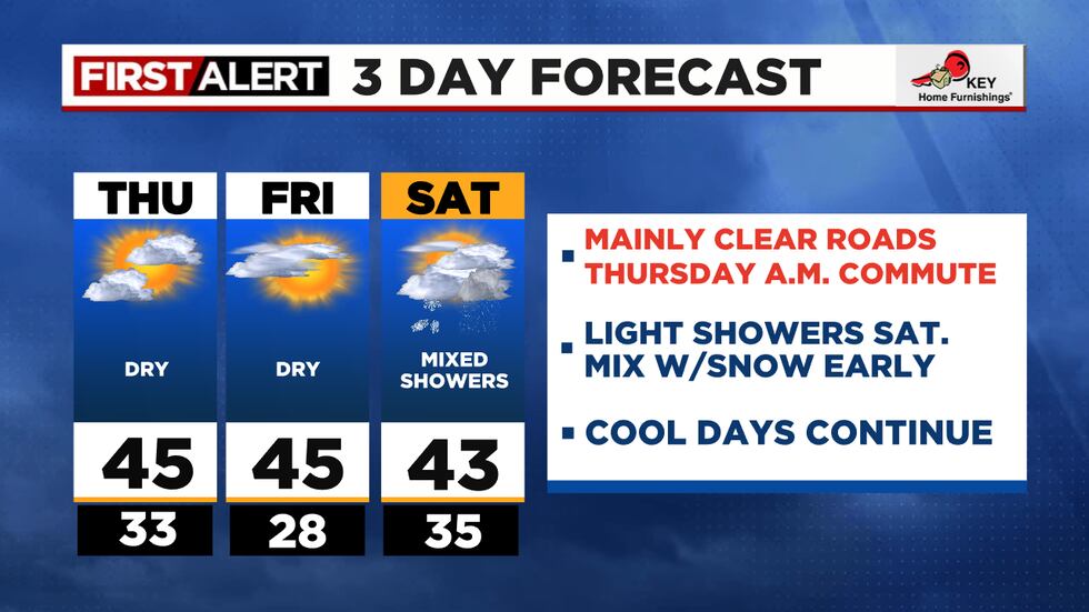 Besides a few areas of frost and fog, there shouldn’t be any weather worries starting your day tomorrow. The forecast is mainly dry both Thursday and Friday. Highs will be in the mid-40s and lows in the 20s and 30s.