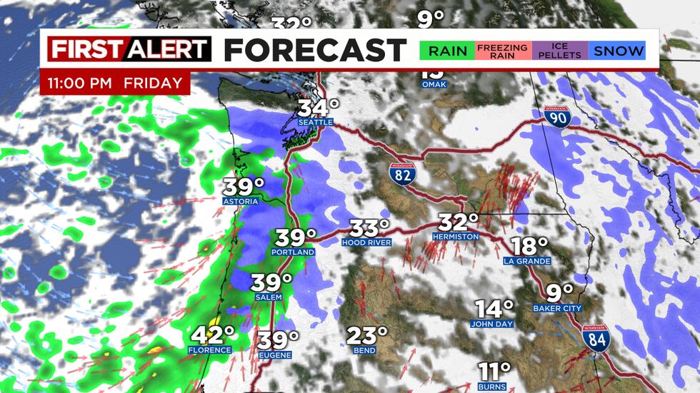 A weak weather system brings light showers inland once again Friday night and Saturday, but sticking snow should remain at/above 1,000′.