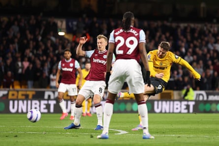 In this fixture last season, the former Wolves captain Maximilian Kilman thought he had scored a late equaliser, only to have it ruled out by VAR. He will not, however, have been pleased to have influenced the opener on this occasion. Strand Larsen was given enough space to slowly turn his frame on the edge of the box and take aim, his shot deflecting off the now West Ham defender Kilman and into the net.